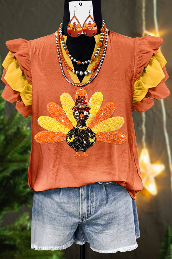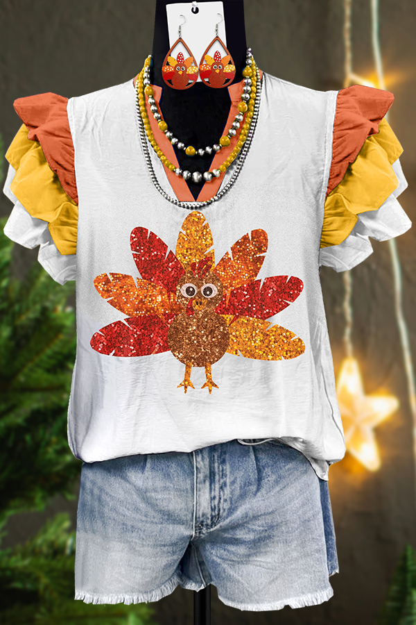Classic Thanksgiving Turkey Print Fly Sleeve Blouse