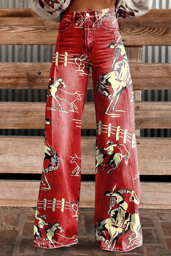 Vintage Wild West Cowboys Print Tiered Palazzo Pants