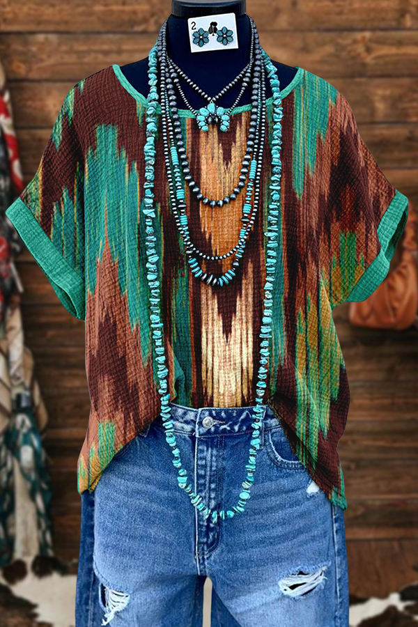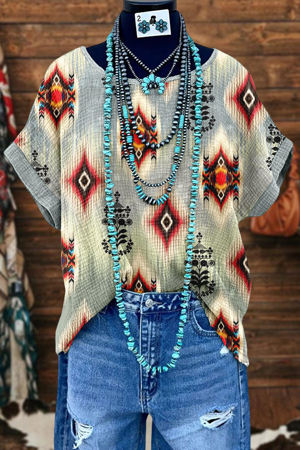 Retro Western Aztec Ethnic Style Washed Dolman Sleeve T-shirt