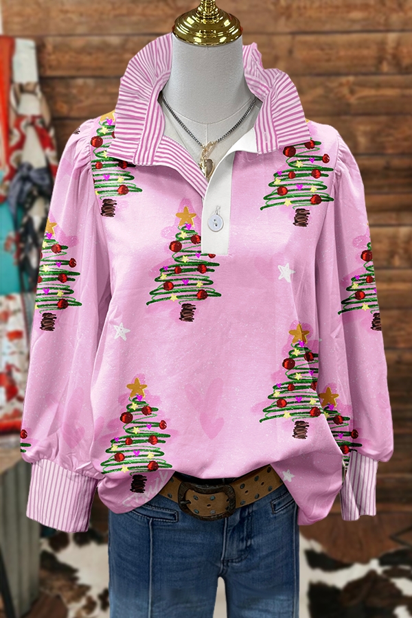 Sweet Christmas Tree Floral Puff Sleeve Blouse