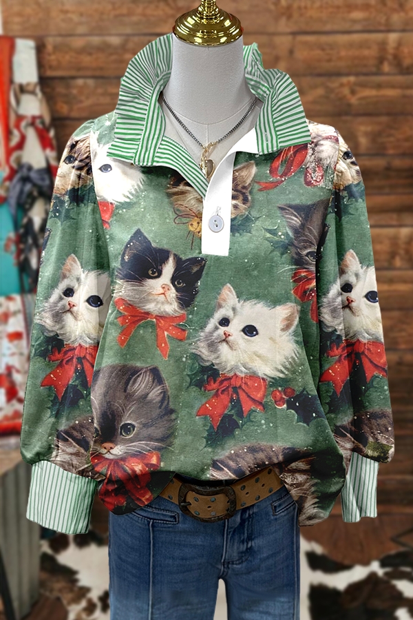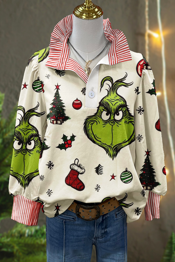 Classic Funny Christmas Grinch Print Stripe Puff Sleeve Blouse