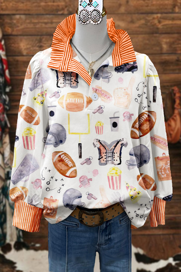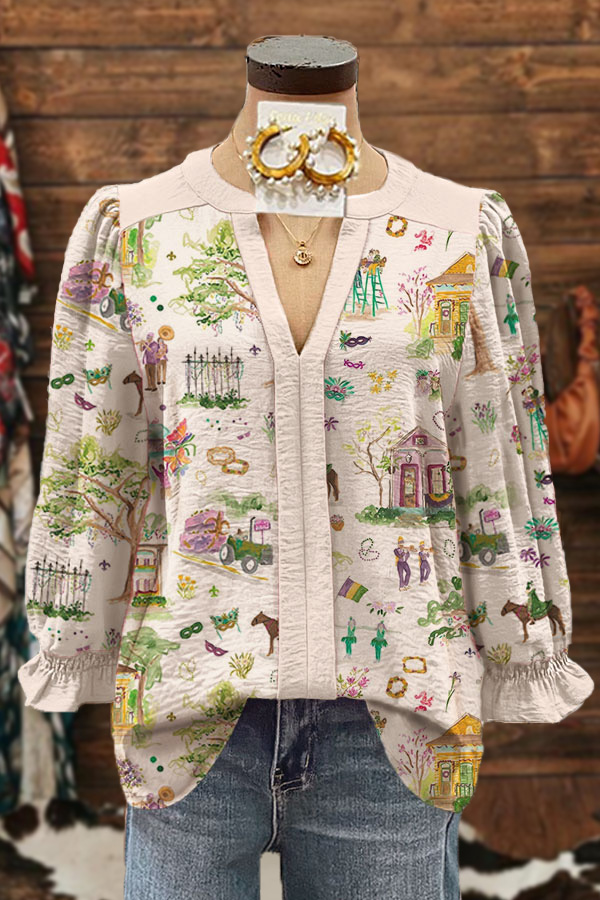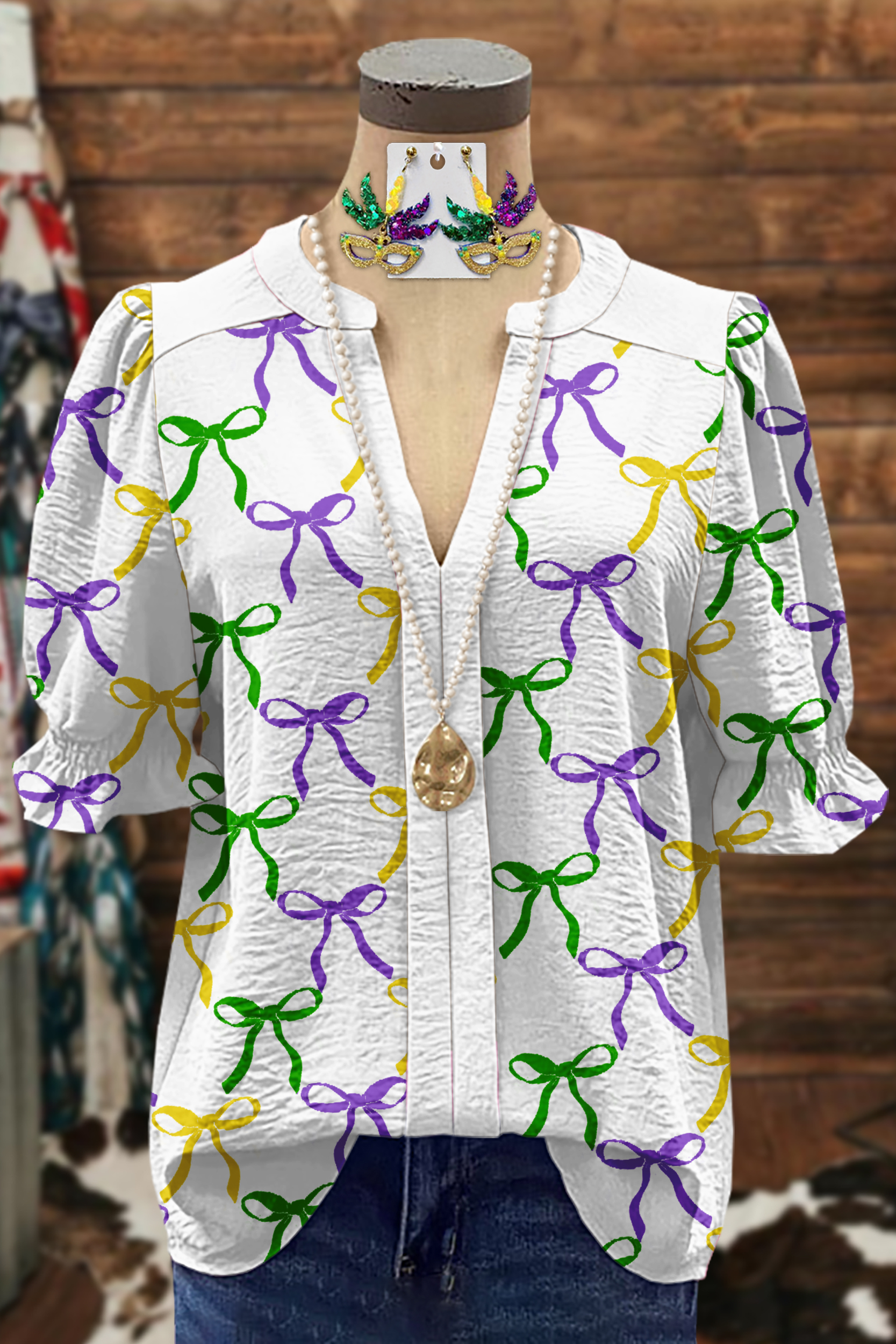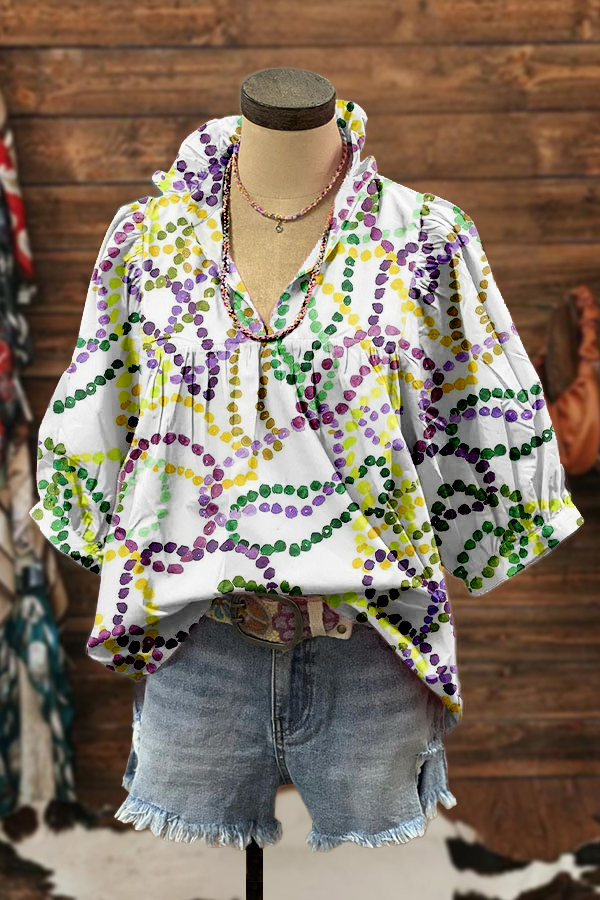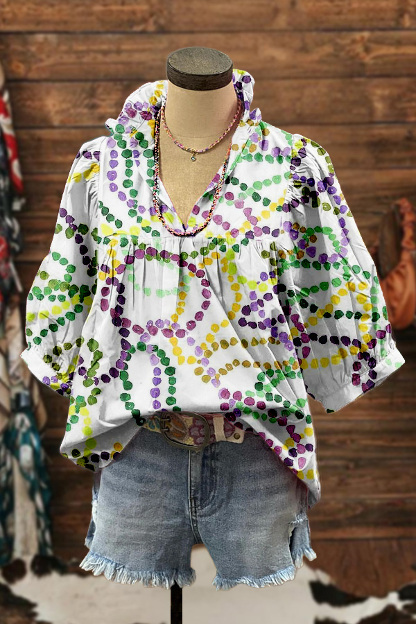 Mardi Gras Print V-neck Pleated Puff Sleeve Blouse