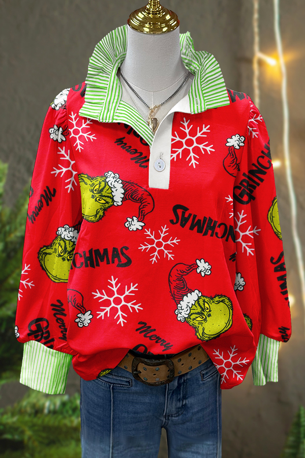 Christmas Grinch Print Contrast Panel V-neck Blouse