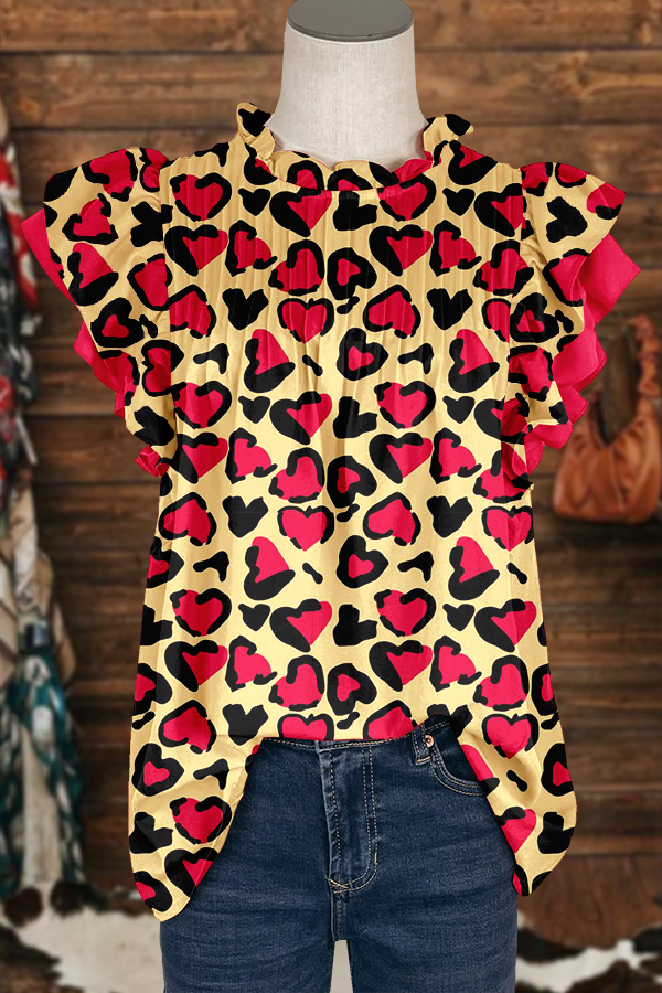 Cute Valentine's Day Heart Print Ruffled Sleeve Paneled Pleated Blouse