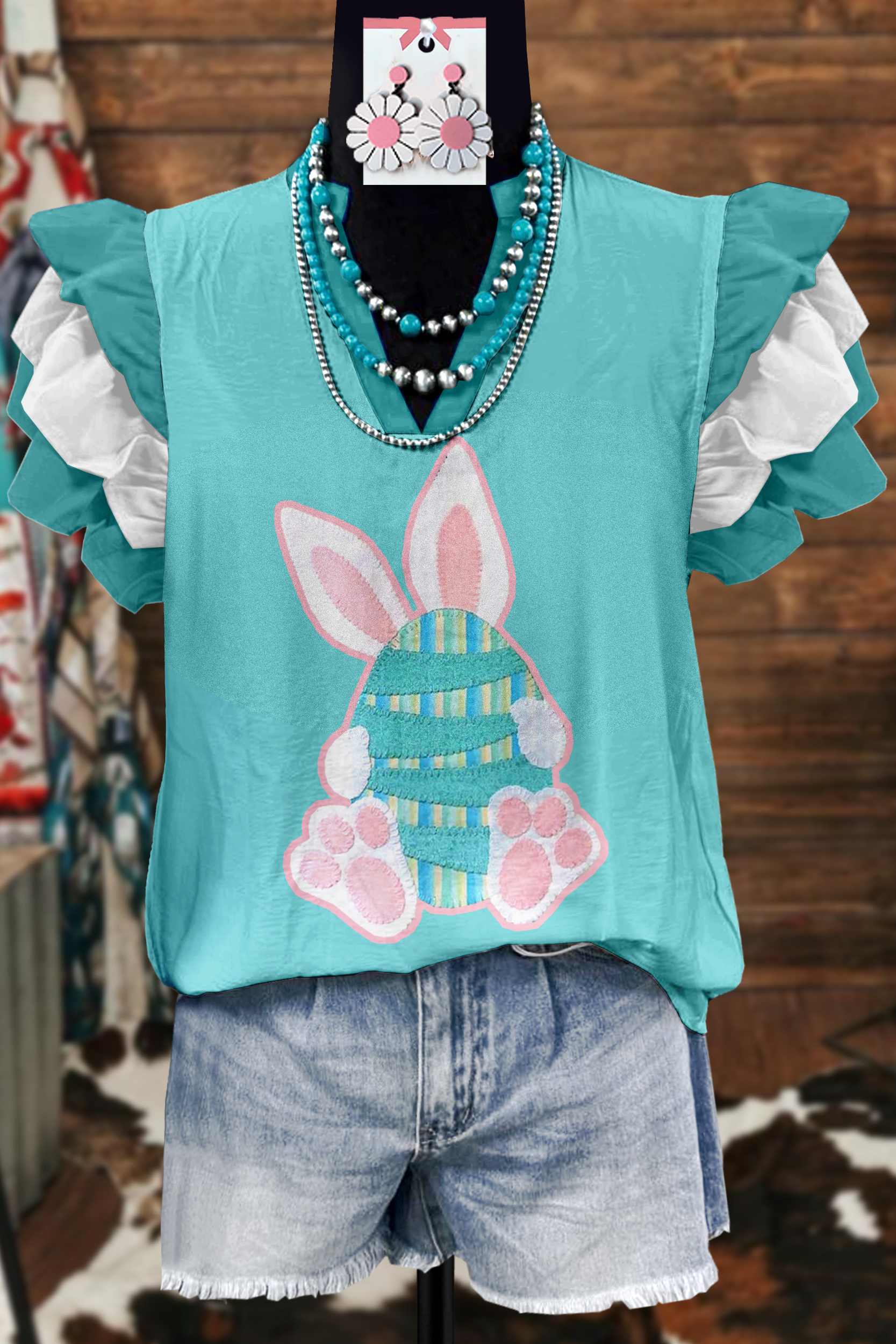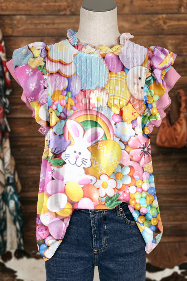 Easter Bunny Egg Print Fly Sleeve Blouse