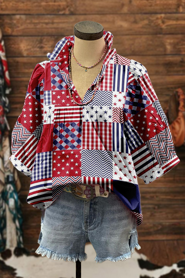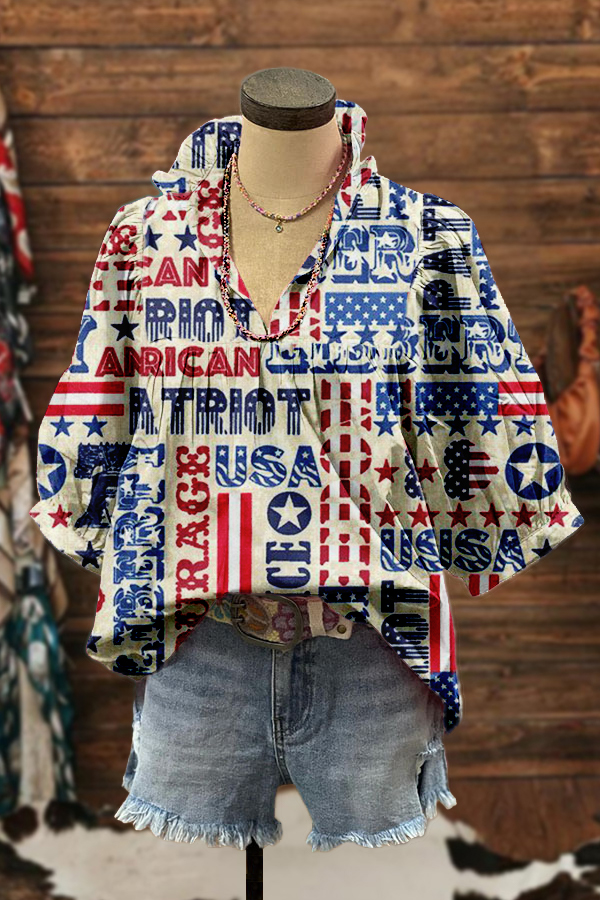 Classic Patriotic Day Print Ruffled Sleeve Paneled Pleated Blouse