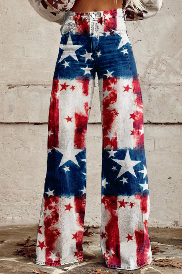 Classic American Flag Print Wide Leg Pants