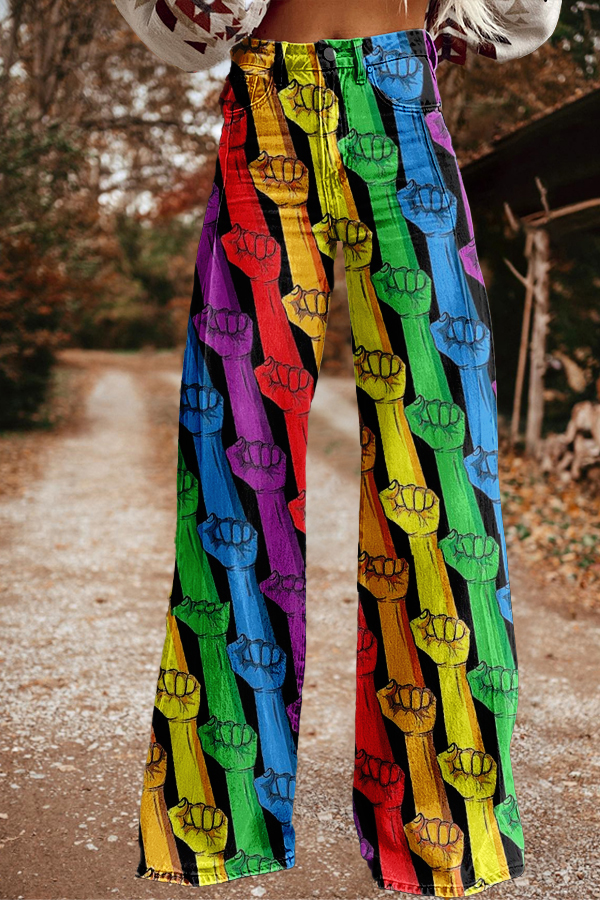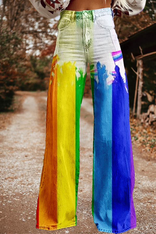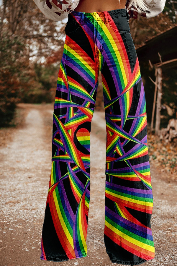 Casual Lgbtq Rainbow Stripe Print Wide-Leg Trousers