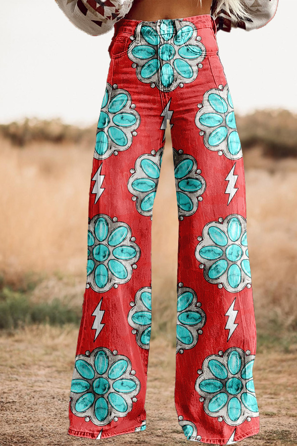Vintage Western Turquoise Print Wide Leg Trousers