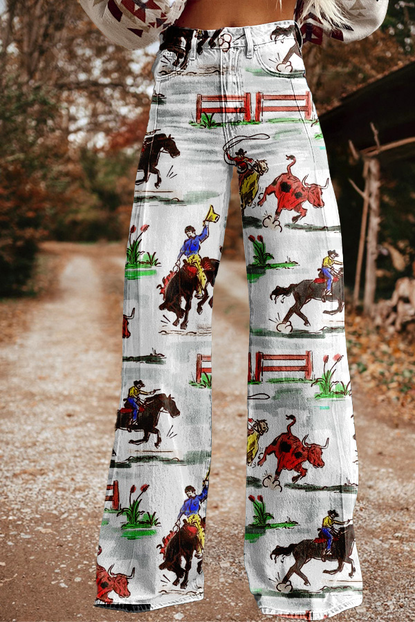 Western Cowboy Horse Racing Print Wide Leg Pants