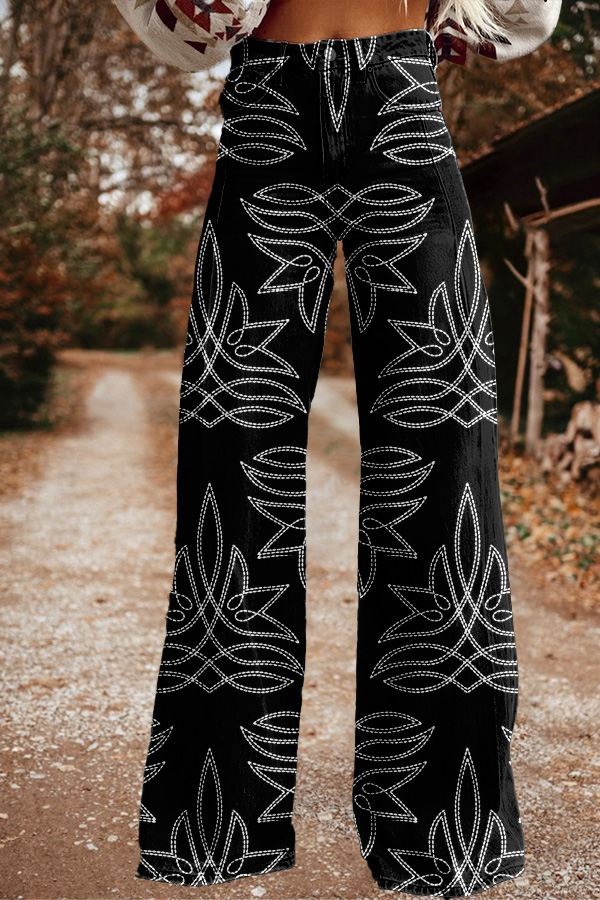 Vintage Western Boots Print Wide Leg Trousers