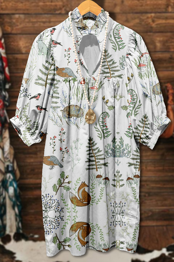 Vintage Abstract Print Asymmetric Ruffle Dress