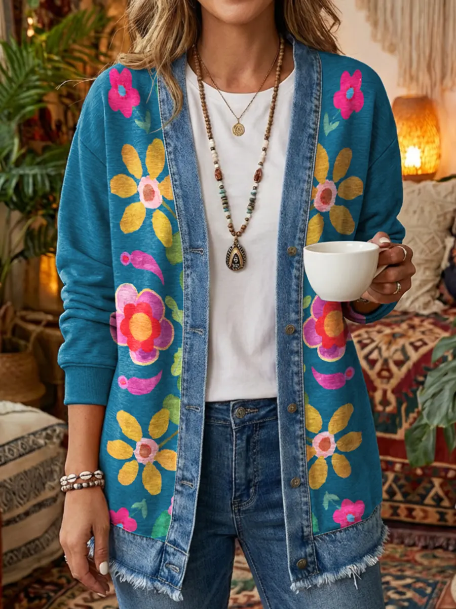 Women's Retro Bohemian Floral Art Print Casual Long-Sleeve Denim Cardigan Coat