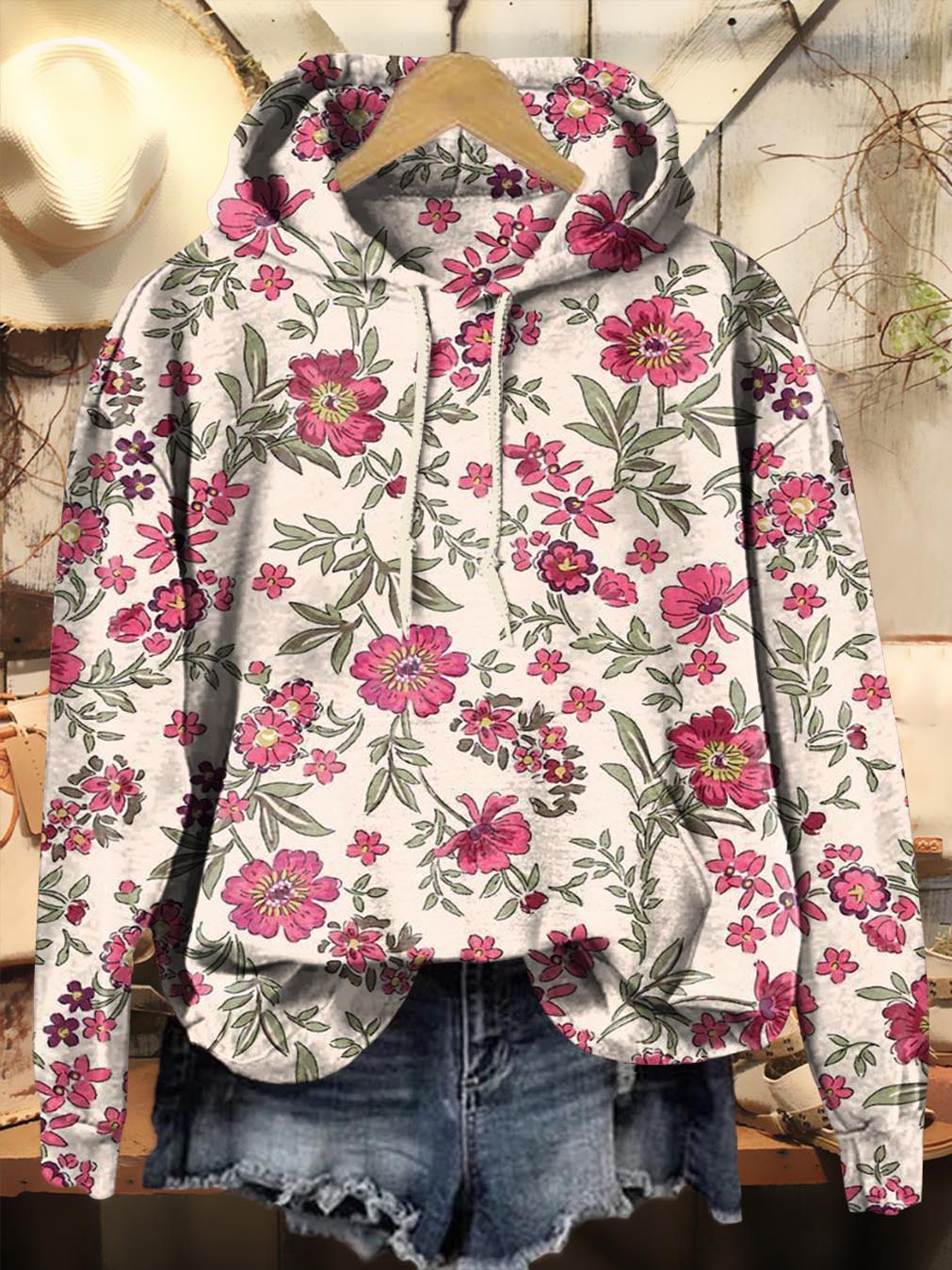 Women's Multicolor Floral Print Artistic Casual Long-sleeve Crew Neck Pocket Cotton Denim T-shirt