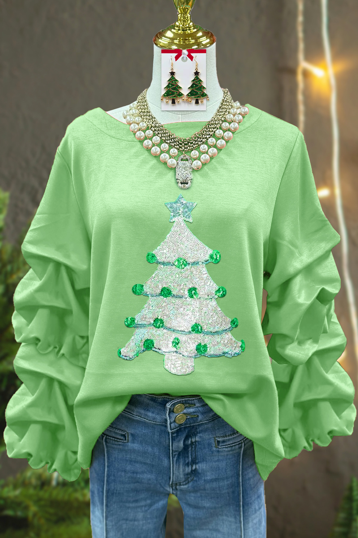 Classic Christmas Tree Sequined Pleated Sweatshirt