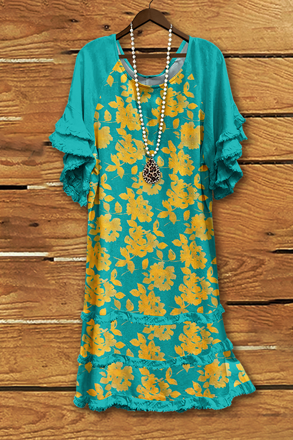 Vintage Floral Print Ruffled Raglan Sleeve Dress