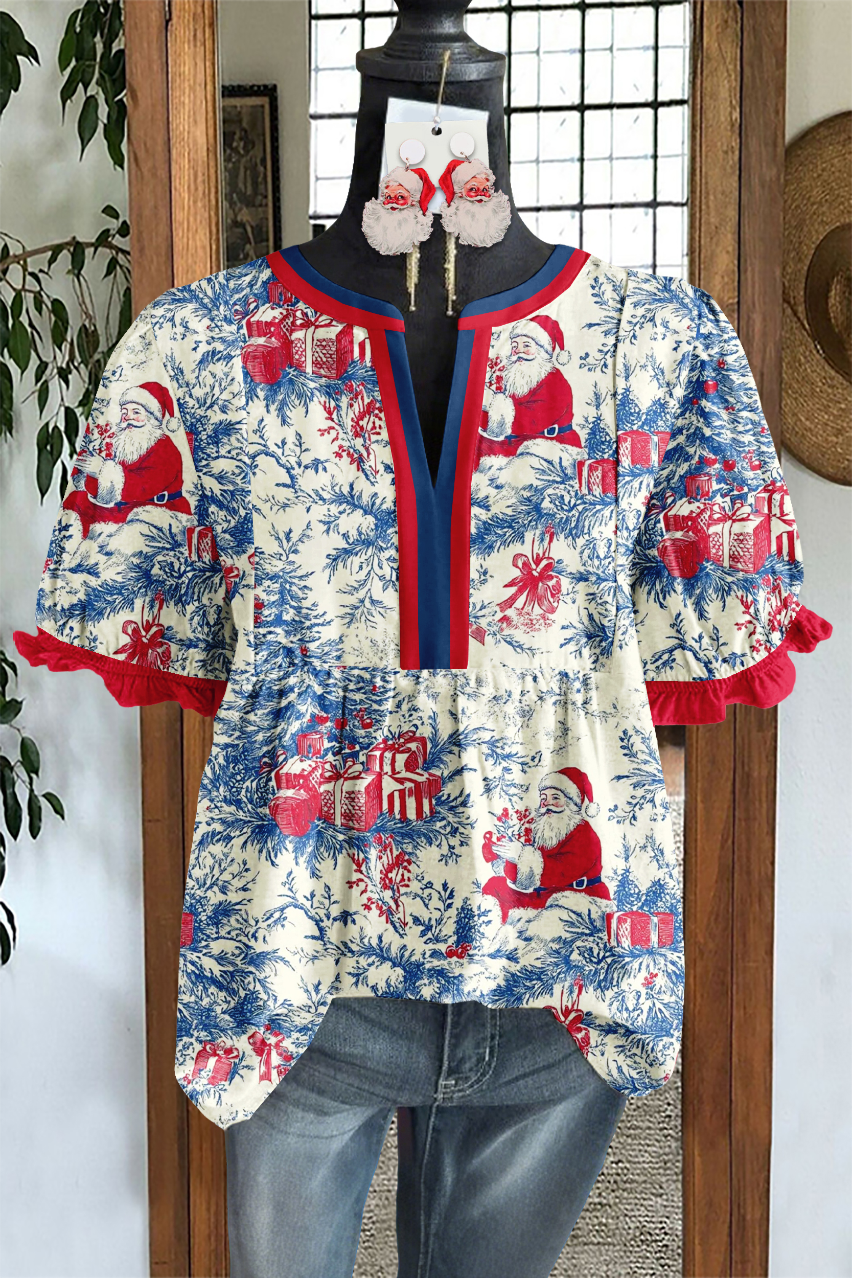 Ruffle Sleeve Santa Claus Print T-Blouse