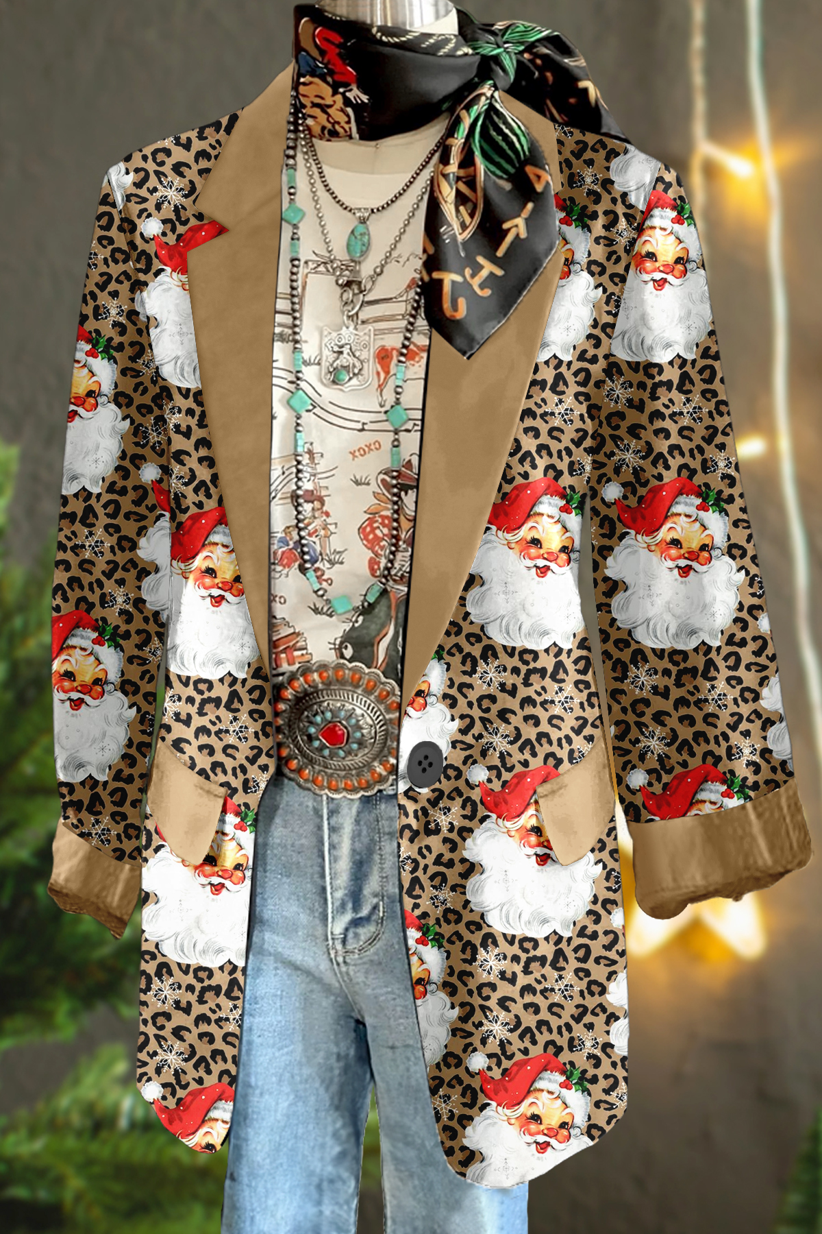 Leopard Mixed Santa Print Contrast Paneled V-neck Blouse