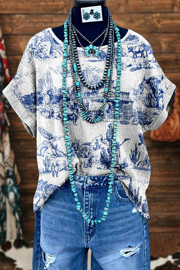 Retro Western Aztec Ethnic Style Washed Dolman Sleeve T-shirt