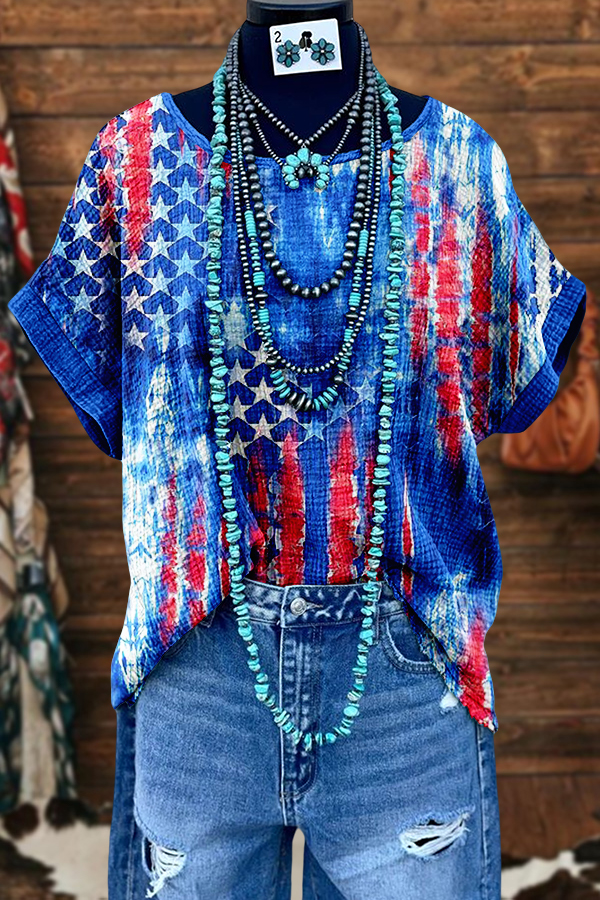 Retro American Flag Patriotic Day Washed Dolman Sleeve T-shirt
