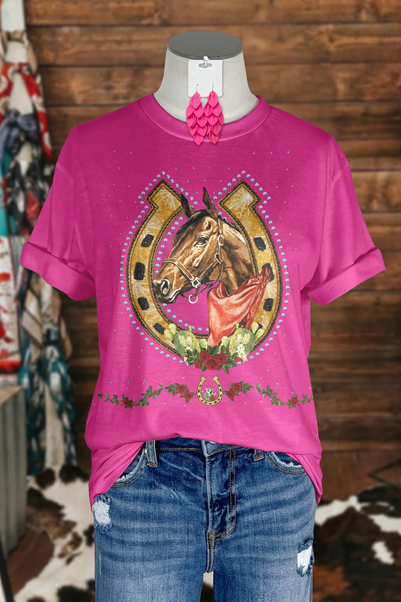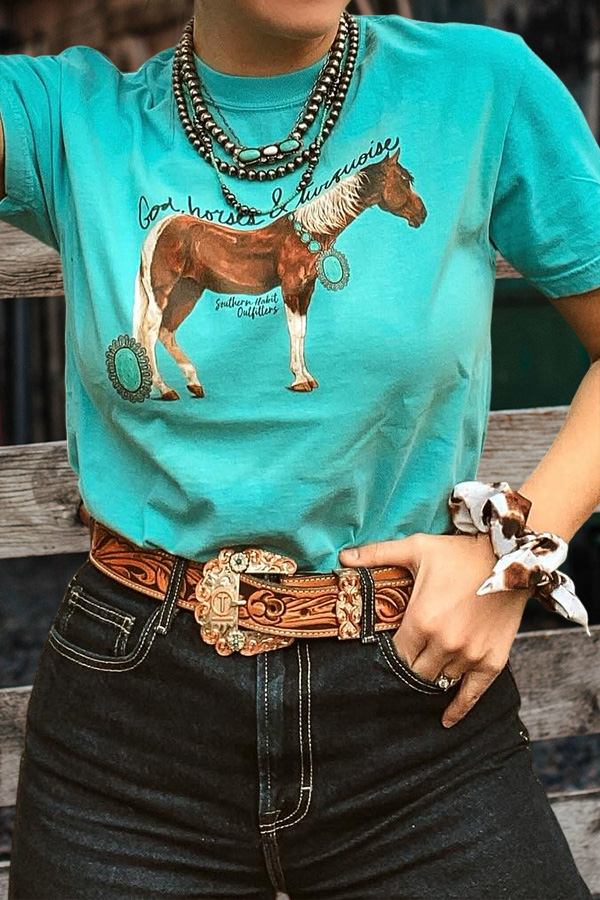 Western Horse Floral Horseshoe Print T-Shirt