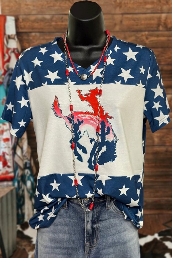 Classic USA Floral Star Print Pleated Fly Sleeve Blouse