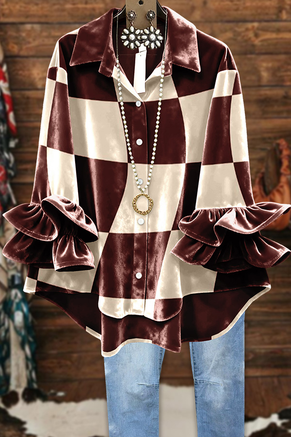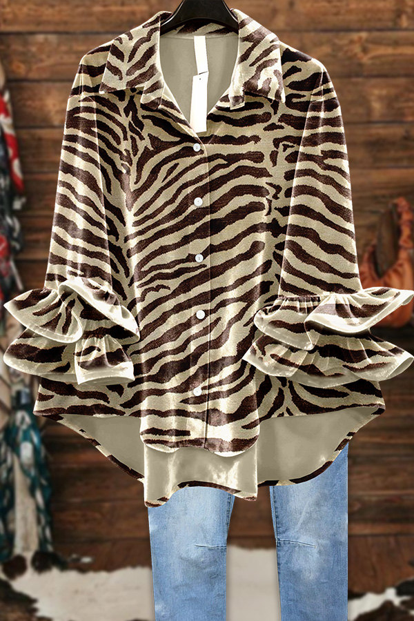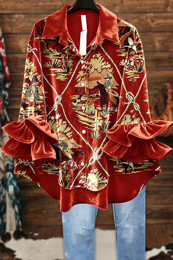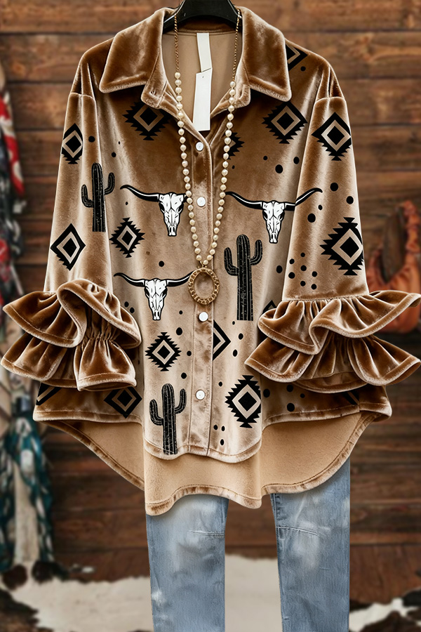 Western Boot Stitch Aztec Ruffled Velvet Blouse