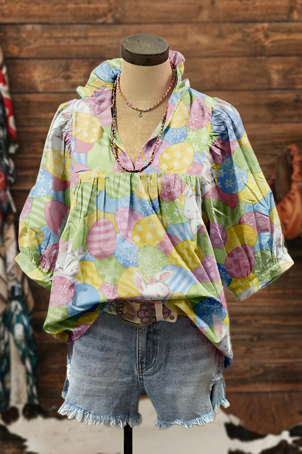 Sweet Bunny Easter Egg Print Puff Sleeve Blouse