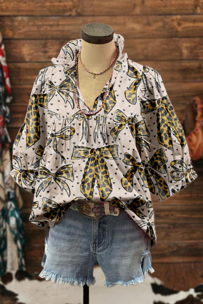 Cute Bow Leopard Print Puff Sleeve Blouse