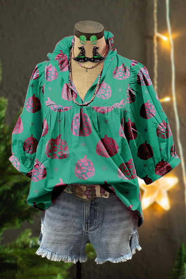 Halloween Pumpkin Print Puff Sleeve Blouse