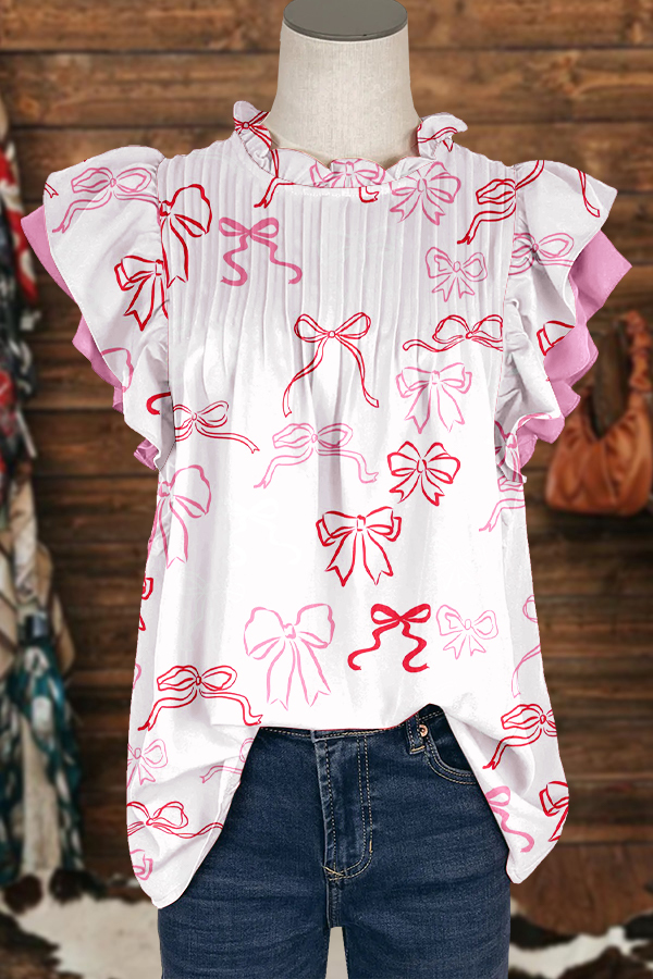 Cute Valentines Bow Print Ruffled Sleeve Paneled Pleated Blouse