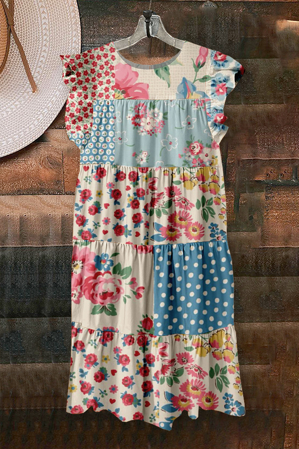Cute Pastoral Stitching Floral Print Ruffled Pleated Dress