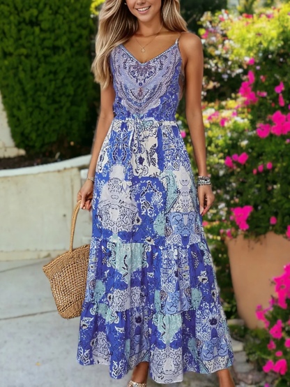 Bohemian Paisley Floral Drawstring Waist Slip Dress