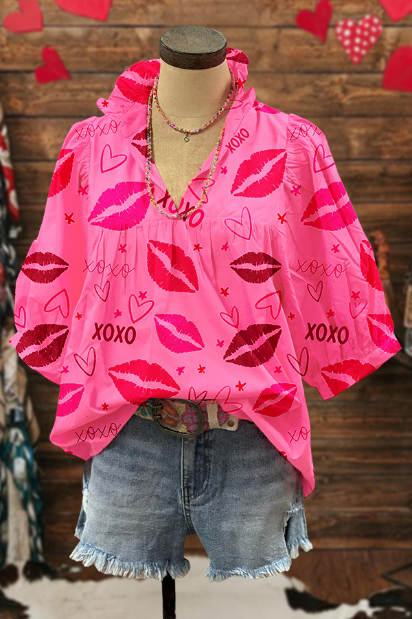 Heart Lip Print Ruffle V-neck Blouse