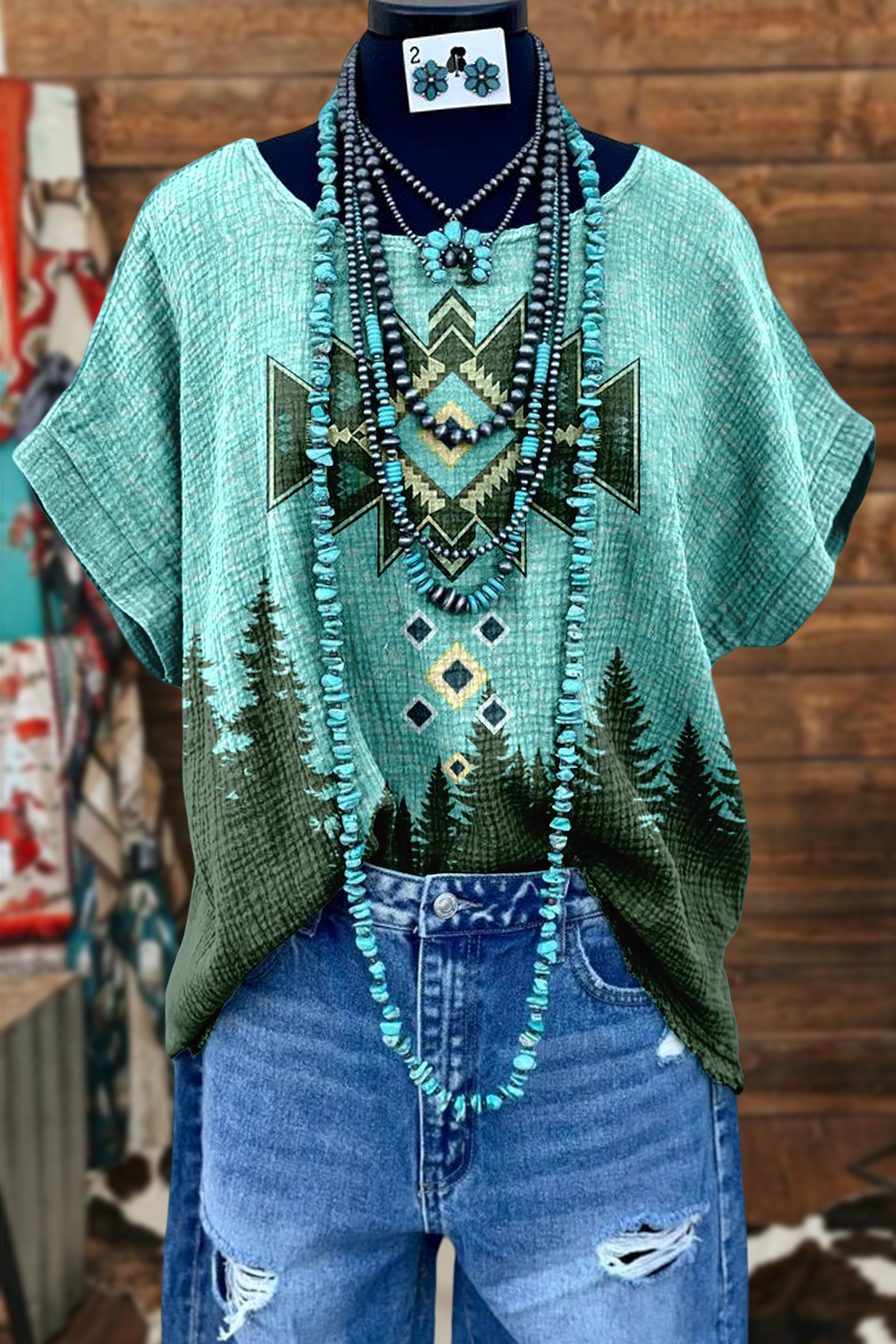 Vintage Aztec Print Distressed Bat Sleeve T-Shirt