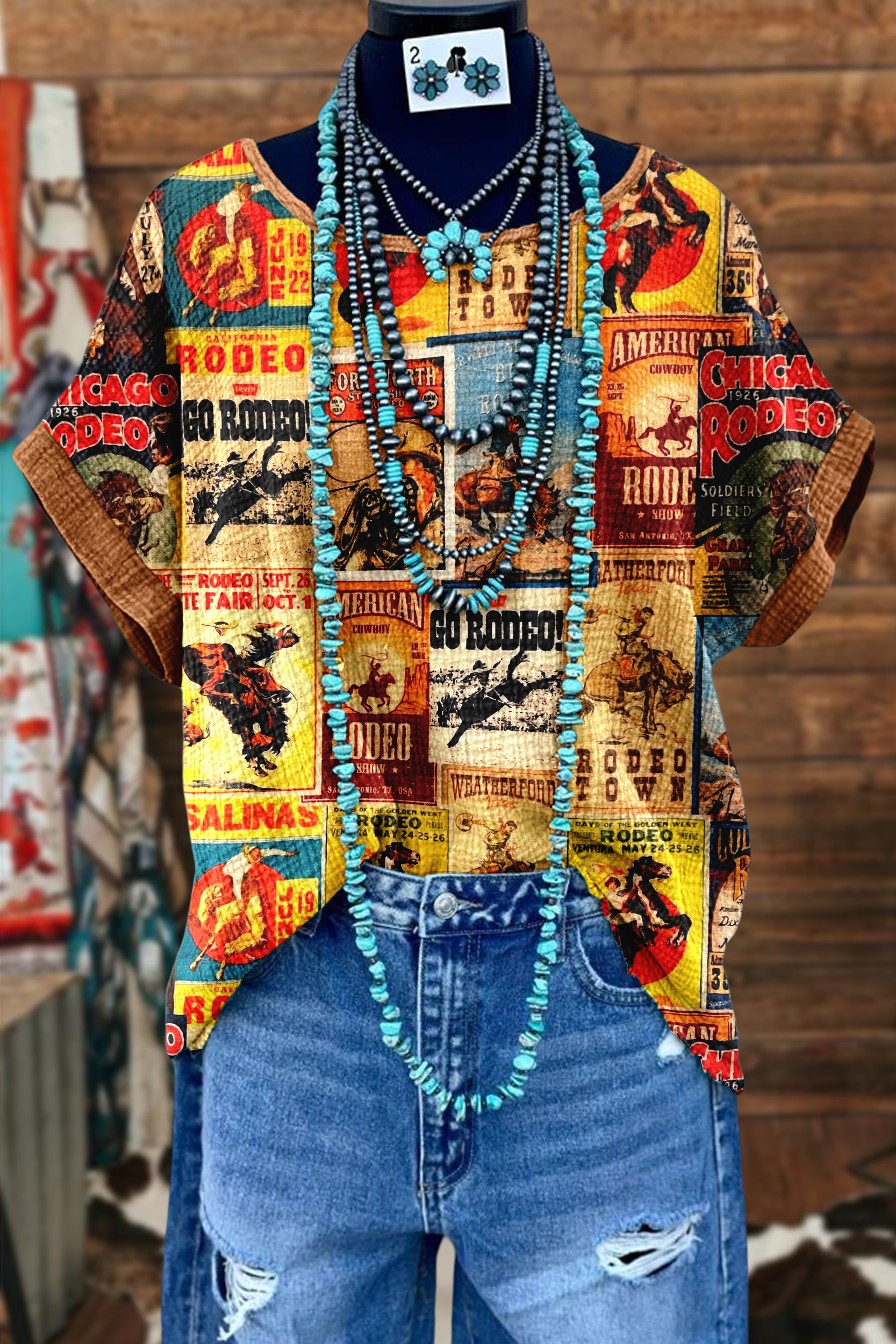 Western Rodeo Cowboy Print Textured Bat Sleeve T-Shirt