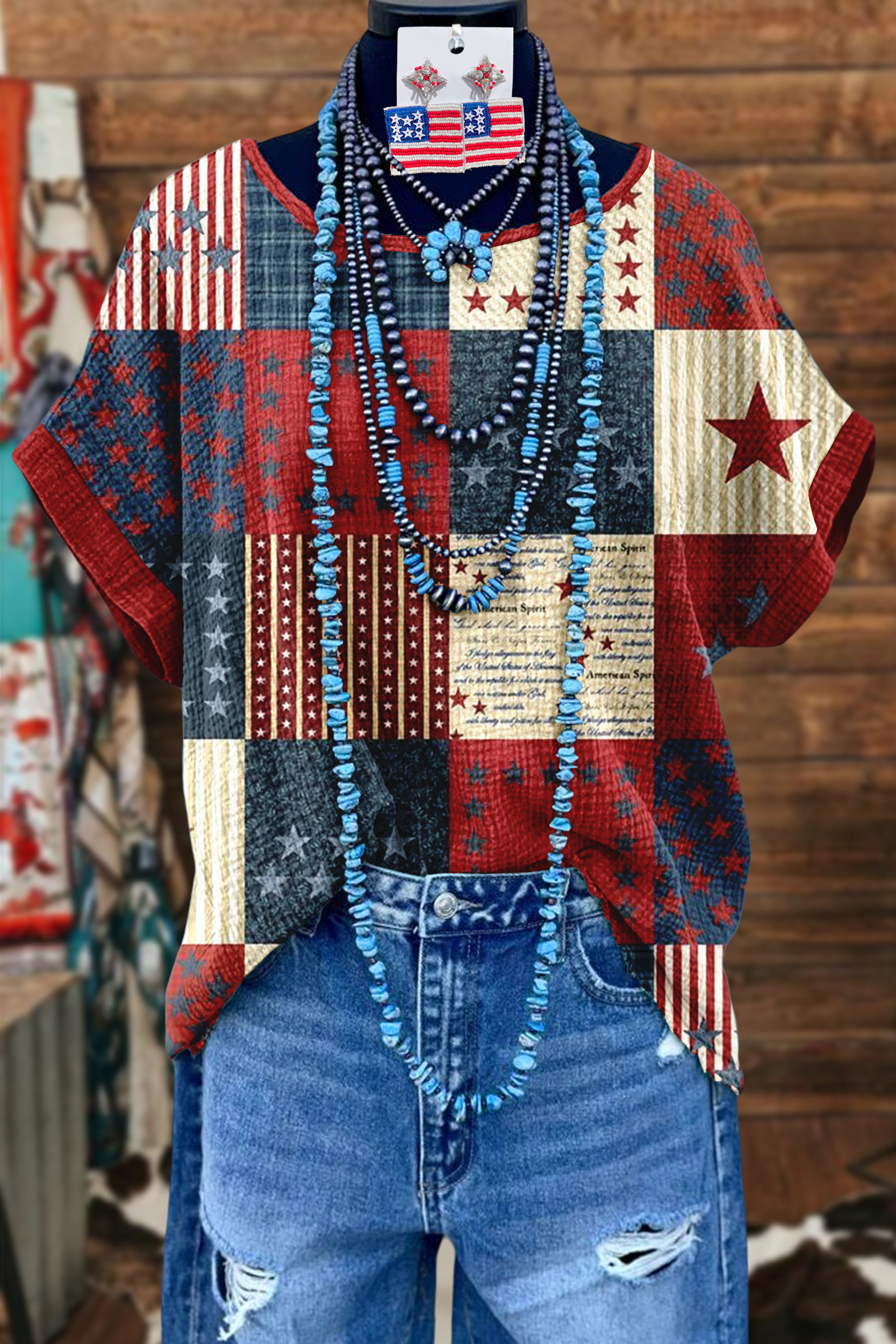 Stay on trend this season in our new casual, round neck t-shirt. We especially love the graphic print fabric and think this piece will be a new favorite in your closet!