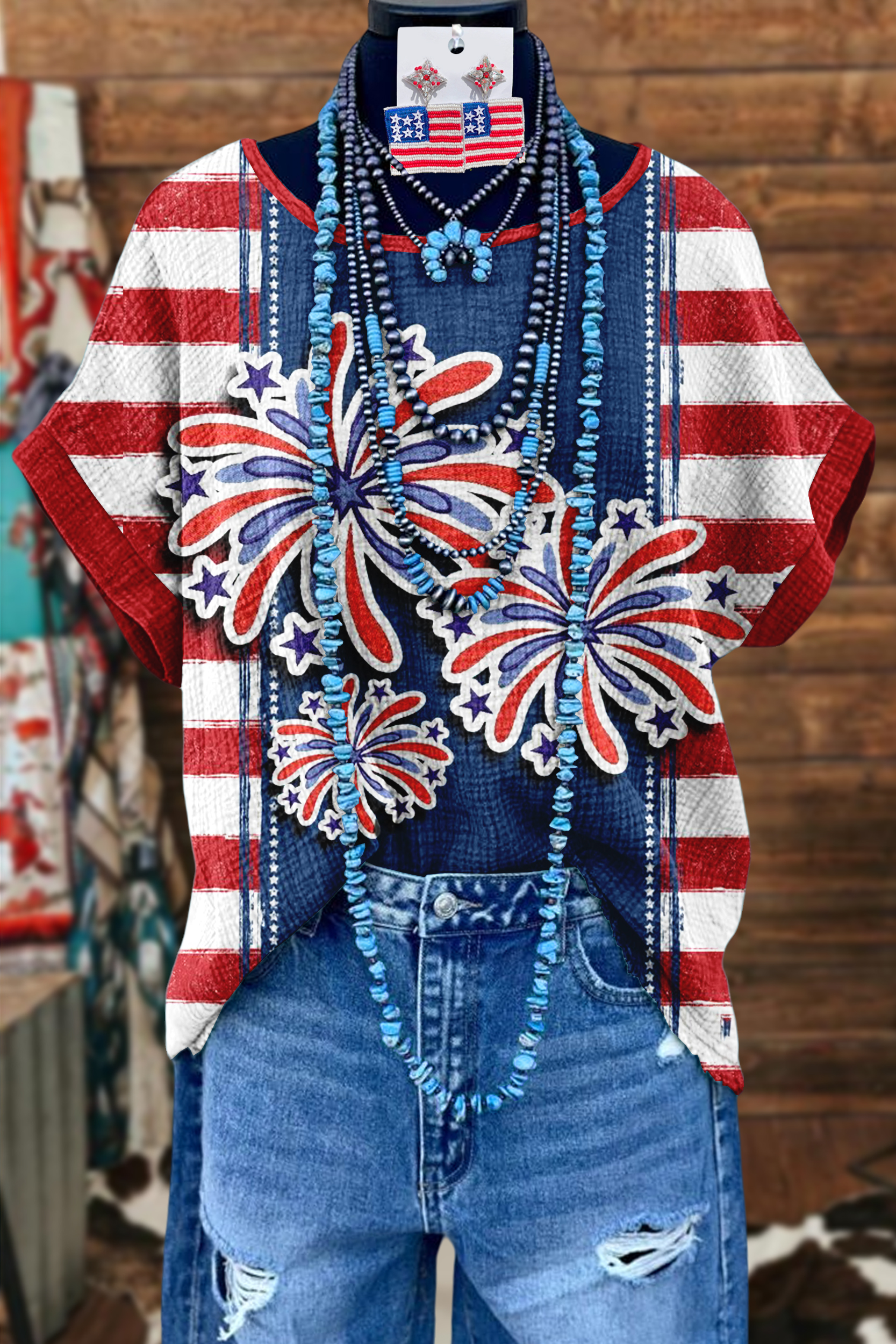 Classic USA Firework Stripe Textured Bat Sleeve T-Shirt
