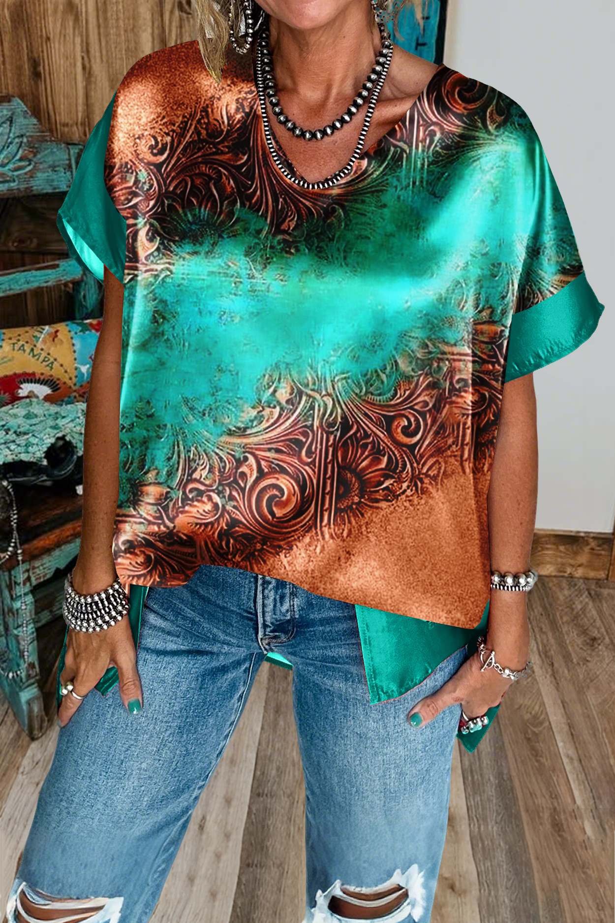 Stay on trend this season in our new casual, v neck top. We especially love the graphic print fabric and think this piece will be a new favorite in your closet!