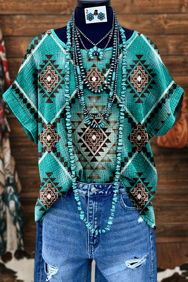 Retro Western Aztec Ethnic Style Washed Dolman Sleeve T-shirt