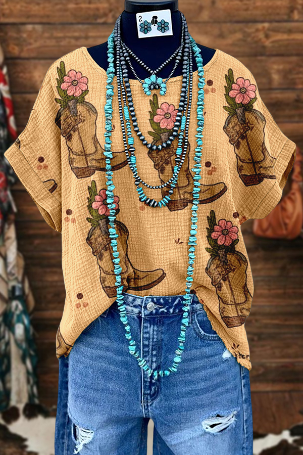 Chic Western Cowboy Boots Washed Dolman Sleeve T-shirt