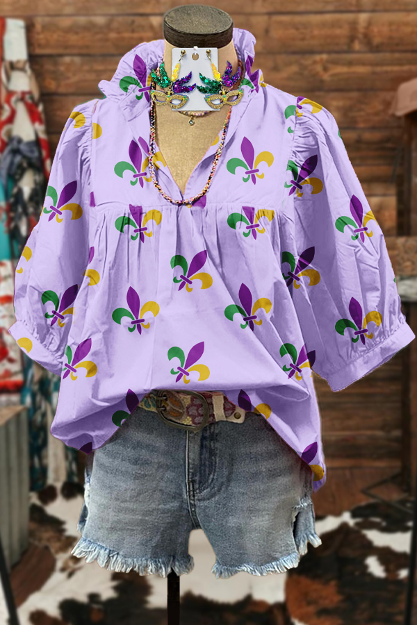 Classic Mardi Gras Print Puff Sleeve Blouse