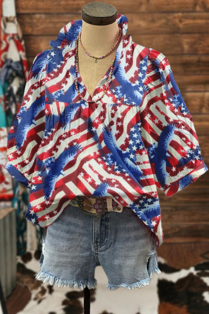 Classic Independence Day Eagle Print Puff Sleeve Blouse
