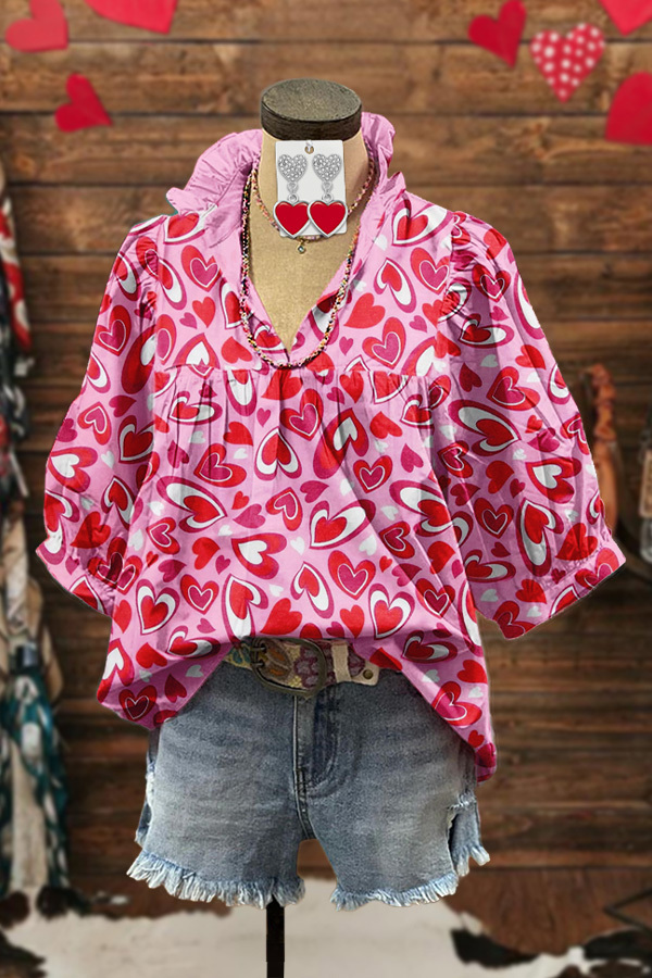 Stay on trend this season in our new classic, v neck top. We especially love the heart fabric and think this piece will be a new favorite in your closet!