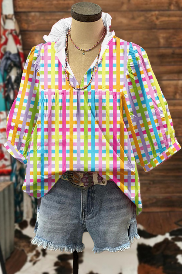 Fresh Easter Check Print Puff Sleeve Blouse