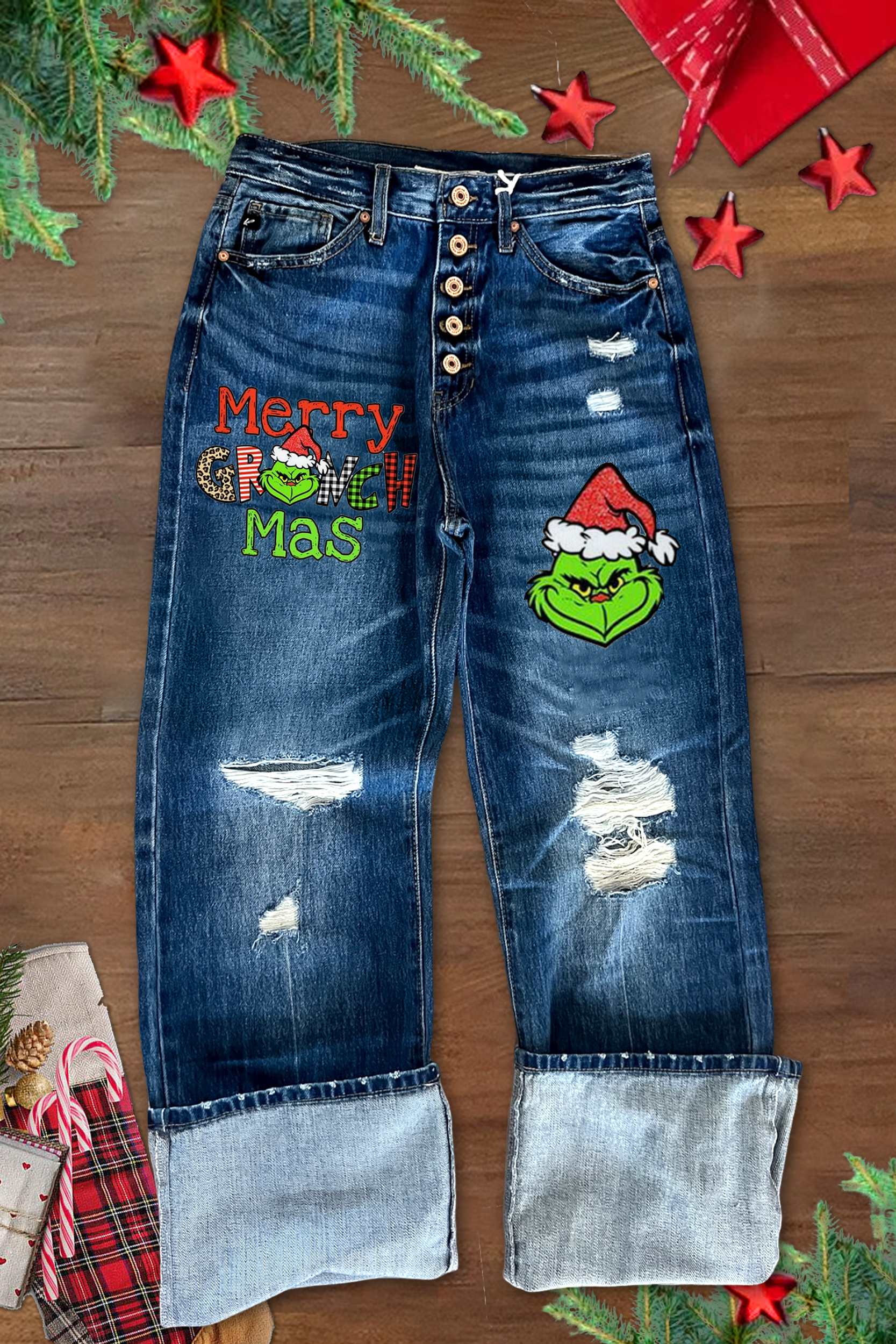 Classic Christmas Grinch Print Ripped High Rise Jeans