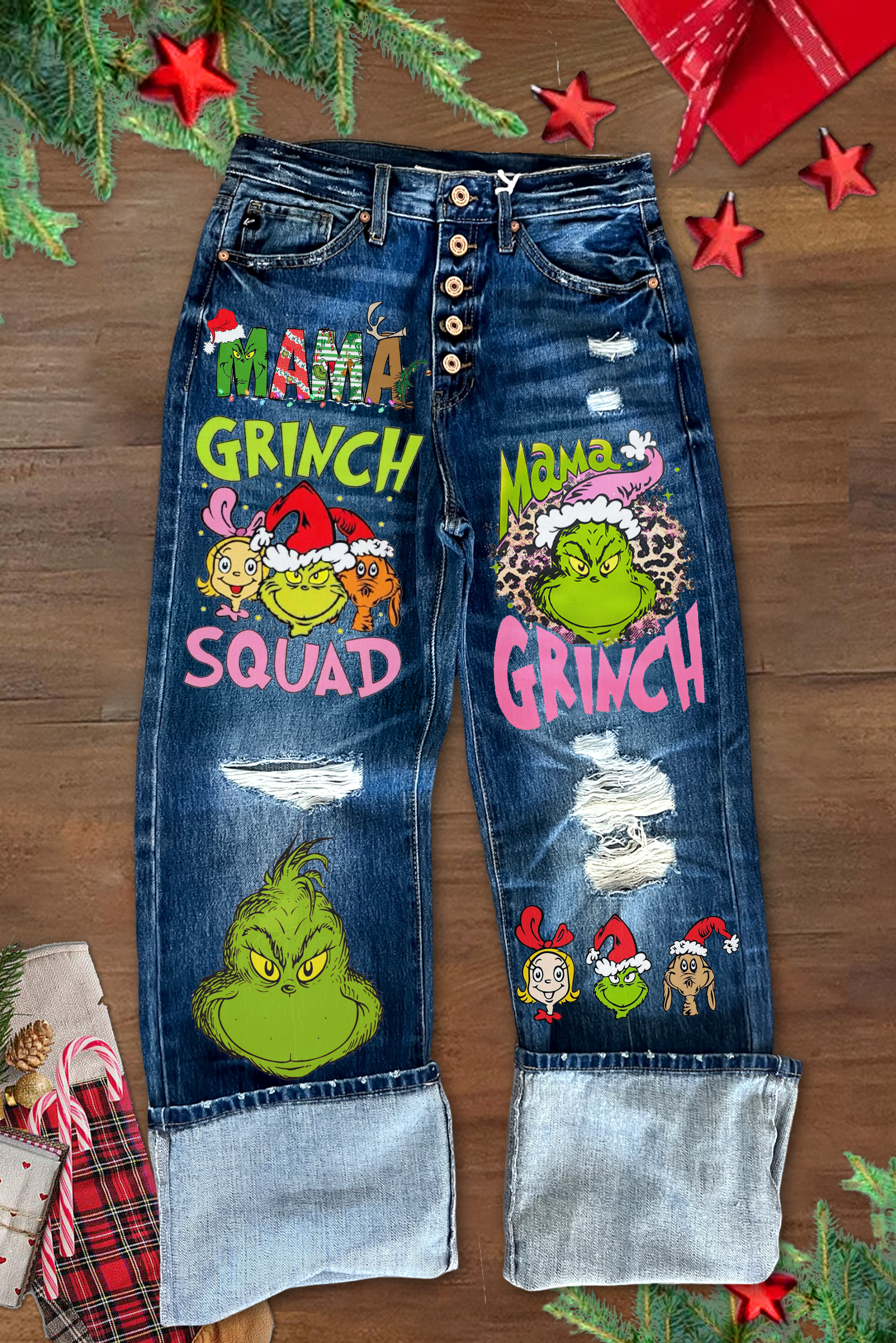 Fun Christmas Grinch Print Ripped High Waist Jeans