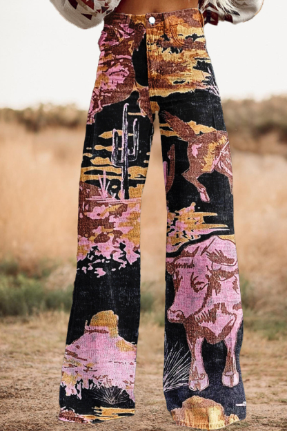 Classic Cow Cactus Print Wide Leg Pants