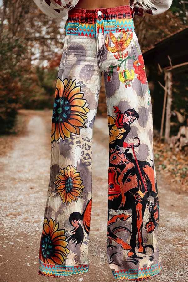 Western Sunflower Leopard Rodeo Print Wide Leg Pants