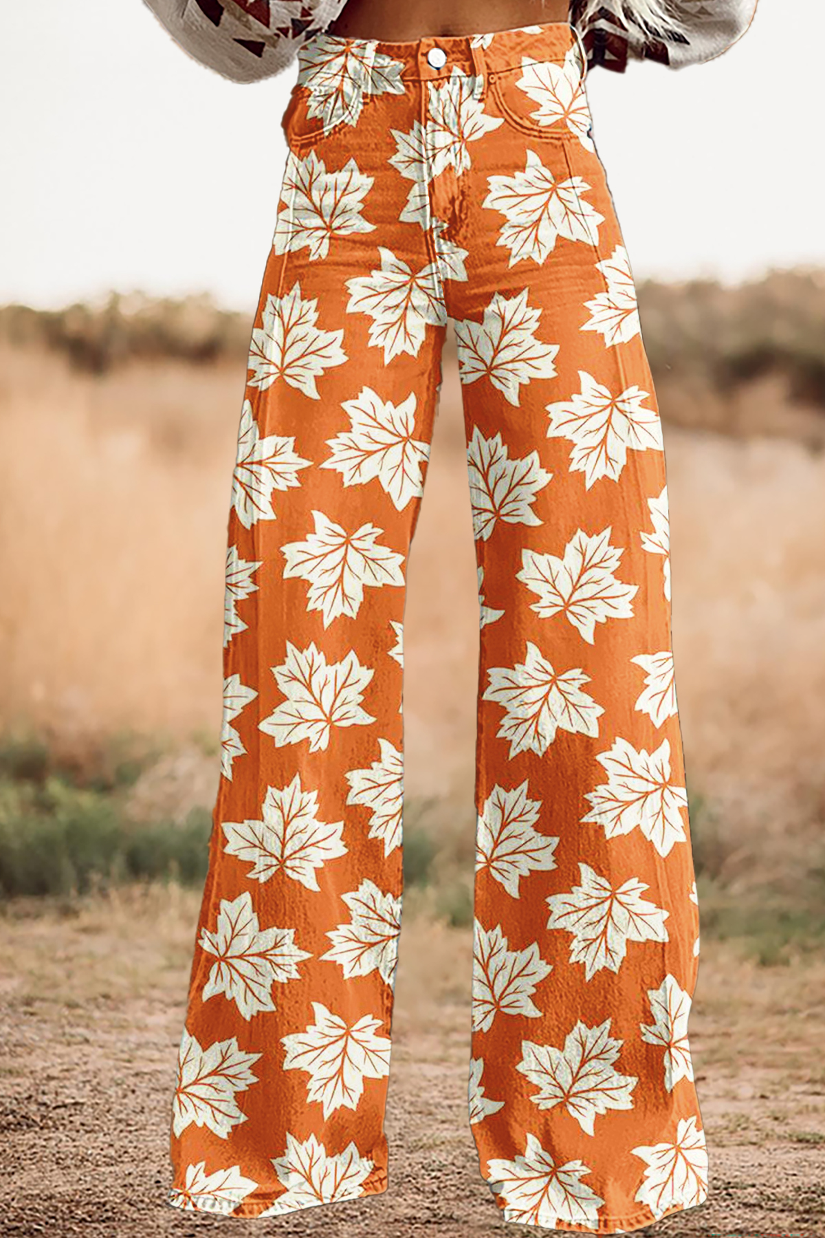 Vintage Autumn Leaf Print Wide-Leg Pants